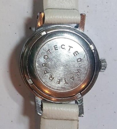 Gravure sur le fond : WATER PROTECTED en cercle à l’extérieur ; perlage à l’intérieur