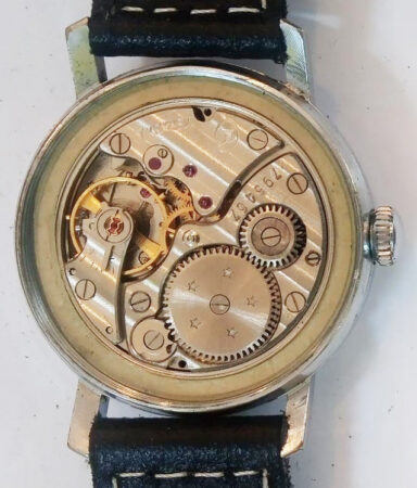 Mentions sur le calibre : n° de série (793467) sur un pont, 17 камня (17 rubis) et logo Vostok sur un autre. 2605 sur la platine, cinq étoiles sur le rochet. Côtes de Genève
