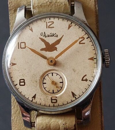 Les Tchaïka qui seront produite à la fin des années ’50 auront un boîtier et un calibre spécial (le 2605 de Tchistopol à 17 rubis avec dateur). Ce modèle a le mécanisme, le boîtier et les aiguilles des Pobeda classiques. Et il ne peut s’agir d’une franken ou d’un ré-emboitage parce que le cadran n’a pas du guichet pour la date comme tous les cadrans des Tchaïka de Tchistopol.