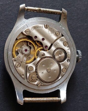Mentions sur le calibre : n¨de série (77647) et 3-56 (3e trimestre 1956) sur un pont, logo de la fabrique et 15 камня (15 rubis) sur un autre. Côtes de Genève. Cinq étoiles sur le rochet.