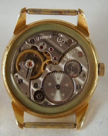 Mentions sur le calibre : n° de série (18143) sur un pont, ancien logo de la fabrique de Tchistopol et 17 камeн sur un autre, 5 étoiles sur le rochet, cotes de Genèves.