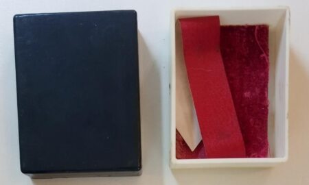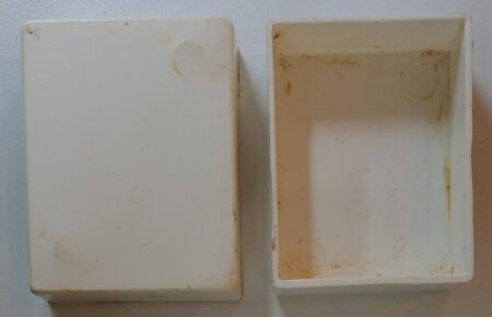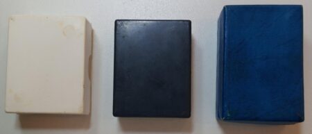 Et deux boîtes de format « boîte d’allumettes » (5,7cm X 4,4cm X 1,9cm), une blanche, une à fond blanc et couvercle noir: