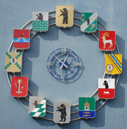 On les retrouve sur l’horloge surplombant l’entrée de la gare routière de Iaroslavl avec celles des autres villes de la région. Dans le sens des aiguilles d’une montre à partir d’une heure : Gavrilov-Yam, Rostov, Tutaev, Myshkin, Pereslavl-Zalessky (maintenant le armoiries de la région de Pereslavl), Iaroslavl, Danilov, Ouglitch (avec le cerf, où se trouve la fabrique Tchaïka), Poshekhonye, Rybinsk , Lyubim, région de Iaroslavl.
