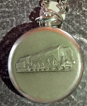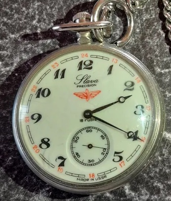 Montre de poche type « savonnette » produite par la Fabrique de Montres de Tcheliabinsk pour la commercialisation en France par la Société anonyme Slava (Besançon) (ce qui explique la marque Slava Précision sur une Molnija)