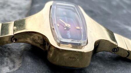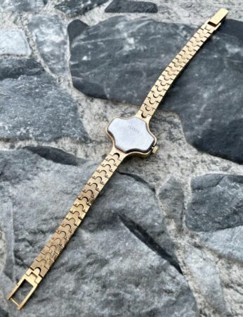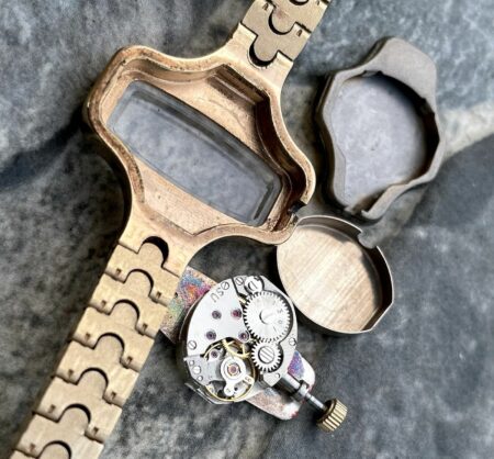 Boîtier de laiton plaqué or 10 microns (poinçon AU10 sur la tranche du boîtier) solidaire d’un bracelet