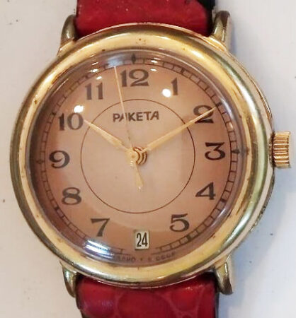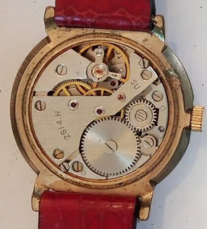 Mentions sur le calibre : 2614.H et SU sur le pont, logo Raketa (raquette symbolisée) sur la platine.