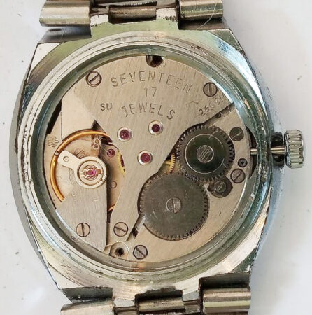 Mentions sur le calibre : dernier logo Poljot (la couronne) sur la platine, et sur un pont : SEVETEEN 17 JEWELS, SU et 2609H