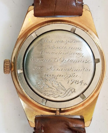 от коллектива / наладки / 1984г. » Soit : « En souvenir, / à Vassily Sémionovitch / Pour le jour de tes 60 ans / (De la part) du collectif des régleurs (ajusteurs) / 1984. »