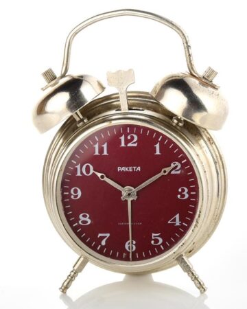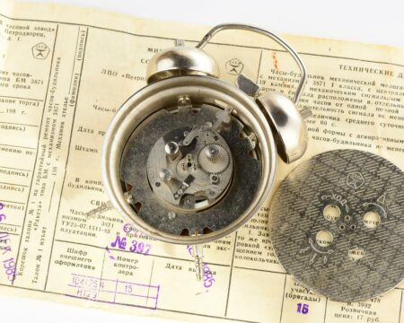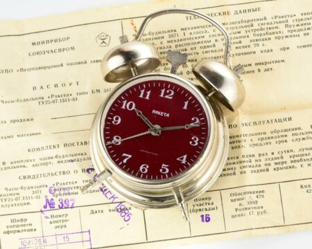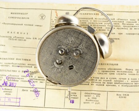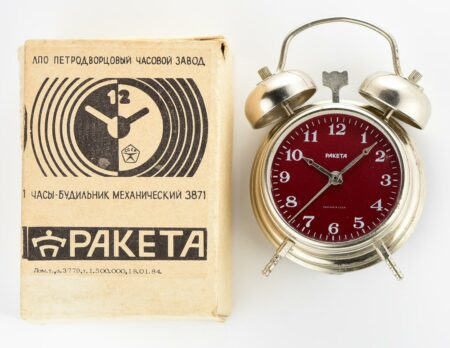 Petit réveil conçu autour d’un mécanisme de montre par la Fabrique de Montres de PetrodvoretsMarque: RaketaMécanisme 3871 à 19 rubisLargeur: 5,5 cmProfondeur: 3 cmHauteur : 9 cmAvec emballage d’origine et passeport du 26 décembre 1985