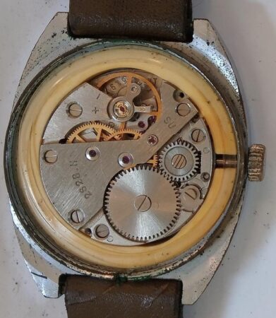 Mentions sur le calibre : N° de série (75197) et logo de Raketa (la raquette symbolisée) sur la platine, 2628.H et SU sur le pont