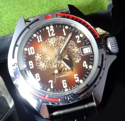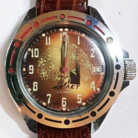 Une des premières, si pas la première Komandirskie avec un cadran à thème. Elle a la particularité de contenir un peu d’or (entrant sans doute dans la composition du cadran, aux nuances dorées)