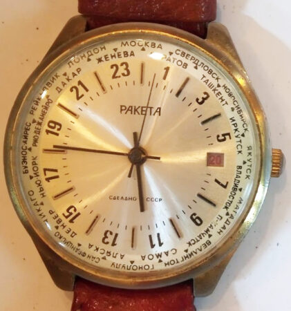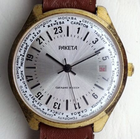 Montre associant un mécanisme chinois tournant sur 12 hezures à un cadran de Raketa 24 heures « World Time »