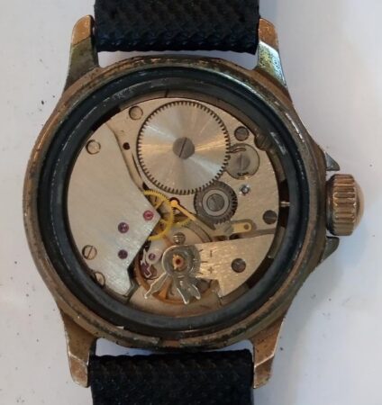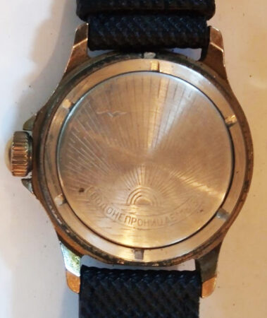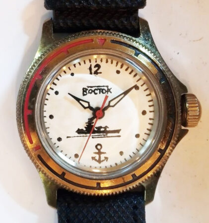 Achetée pour presque rien dans un marché aux puces de Kowloon (Hong Kong) en novembre 2012. Le cadran a été peint à la main. L’opération est un peu mystérieuse car les faux cadrans sont fabriqués en masse en Chine, que celui-ci imite soigneusement un modèle authentique (la Vostok « marine » 2409A/051568) et tout le reste de la montre est authentique et cohérent à ce modèle.