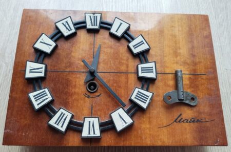 Horloge murale de la Fabrique horlogère de SerdobskMarque: MayakCadran avec le « quatre horloger« Mécanisme: 74122Remontage hebdomadaireDimension du cadran: 25,5 X 17,5 cm