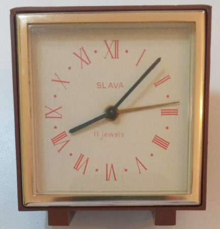 Réveil matin de la 2e Fabrique de Montre de Moscou, pour l’exportation.Marque : SlavaCalibre : 5671 à 11 rubis7,3 cm X 7,8 cm