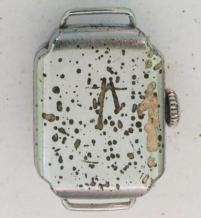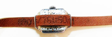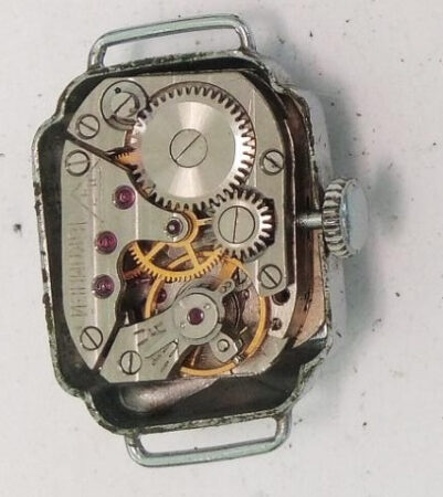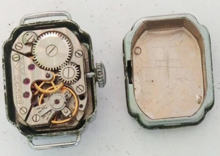 Mentions sur le calibre : N° de série (6854578) sur la tranche, logo triangulaire de la fabrique et 16 камней sur le pont, côtes de Genève