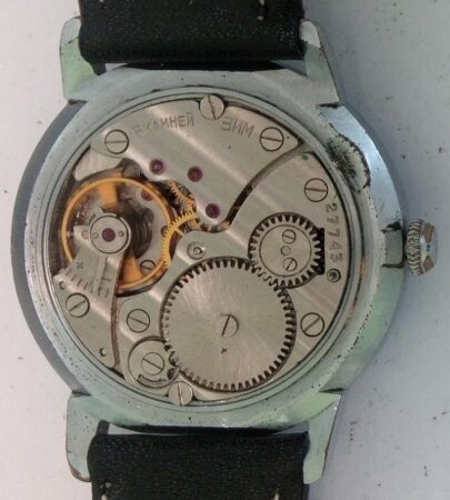 Mentions sur le calibre : ЗИМ et 15 камня (15 rubis) sur un pont, n° de série (27743) sur un autre, 2602 sur la platine. Côtes de Genève