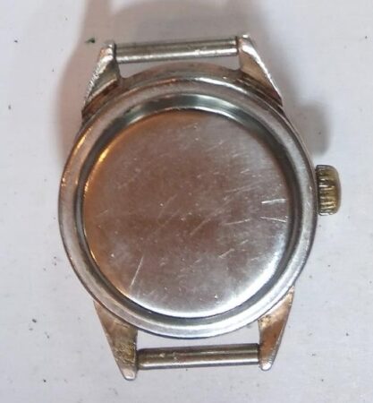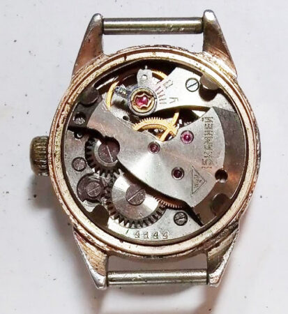 Mentions sur le calibre : N° de série (58761) sur un pont, 15 камней et logo de la fabrique de Penza (initiales ПЧЗ inscrites dans un triangle sur sa pointe) sur un autre.