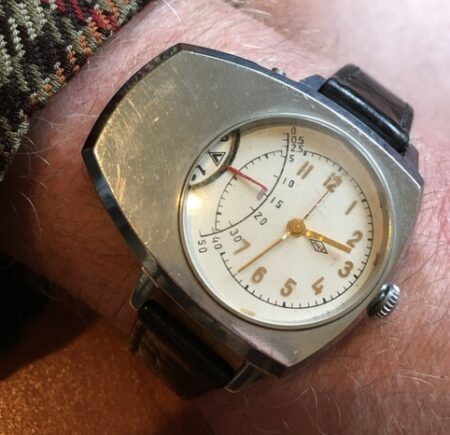 Produite par la Fabrique de Montres de Petrodvorets, cette montre me porte pas la marque Raketa (qui n’existait pas encore) mais le logo de la fabrique (ses initiales dans un losange)