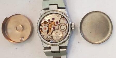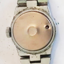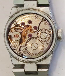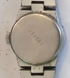 Mentions sur le calibre : 17 JEWELS sur un pont, dernier logo Tchaïka (T dans un écu) sur un autre, 1601A et n° de série (685017) sur un autre encore. Mécanisme strié.
