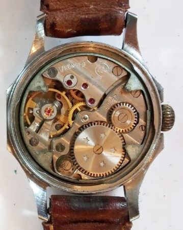 Mentions sur le calibre : n° de série (354405) sur un pont, ancien logo de la fabrique de Tchistopol (initiales dans un cercle bordé de triple traits) et 17 камeн sur un autre, 5 étoiles sur le rochet, cotes de Genèves.