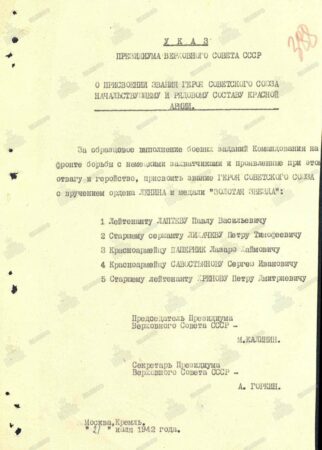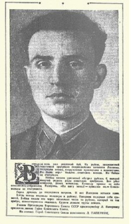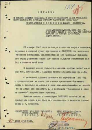 Par décret du Présidium du Soviet suprême de l’URSS, le 21 juillet 1942, le soldat de l’Armée rouge Papernik Lazar Haimovich a reçu à titre posthume le titre de Héros de l’Union soviétique, l’Ordre de Lénine et la médaille « Étoile d’or »: