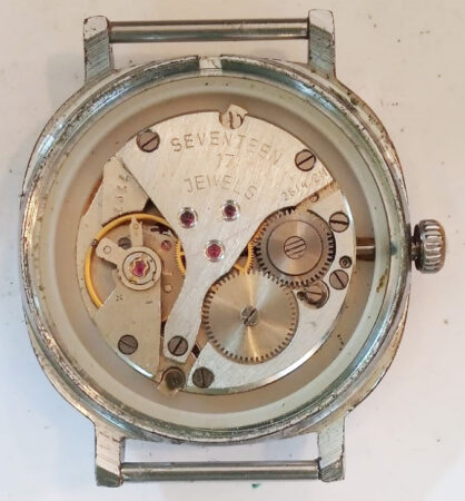Mentions sur le calibre : n° de série sur la platine, SEVETEEN 17 JEWELS, SU, et 2614.2H sur le pont.