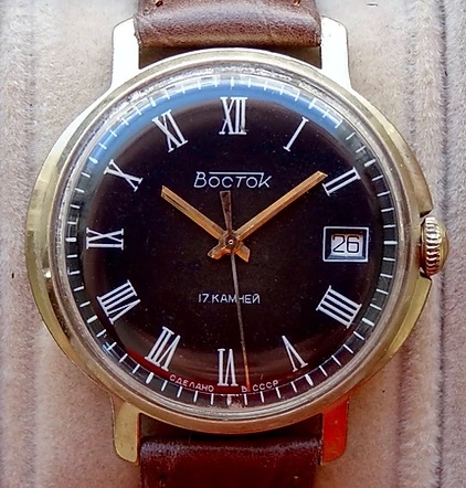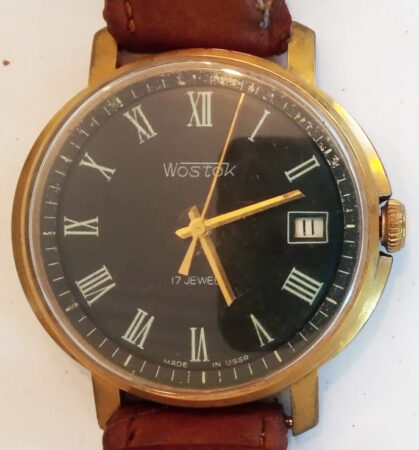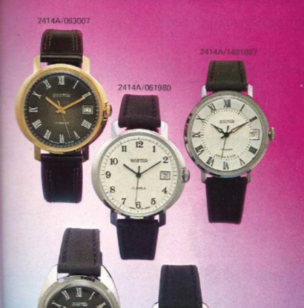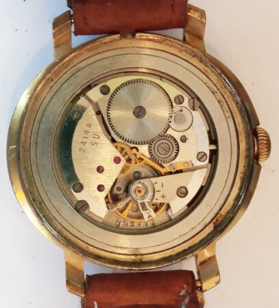 Mentions sur le calibre : 2414A et SU sur le pont, n° de série (749716) et logo Vostok sur la platine