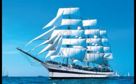 Le Mir (« Paix »), voilier de type trois-mâts carré en acier ayant servi de navire école pour la marine soviétique en 1987. Équipage: 20 officiers, 38 hommes, 144 cadets. Longueur hors-tout: 109,2 m. Voilure: 2771 m² (28 voiles). Déplacement: 2385 tonnes