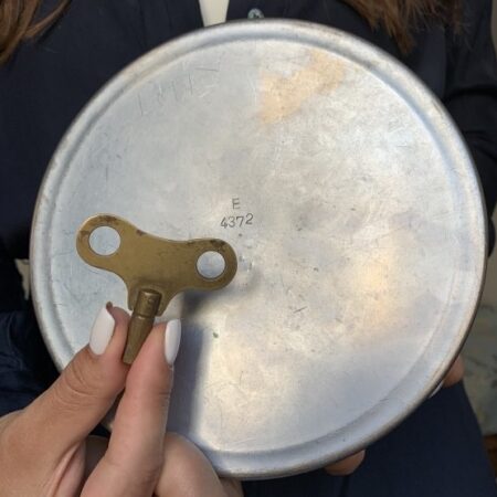 Boitier en laiton chromé, hublot en verre , à remontage mécanique, fonctionnant 7 jours, avec sa clé en laiton, mécanisme 11 rubis.