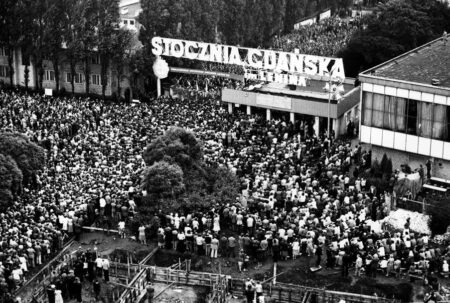 C’est au chantier naval « Lénine » que le syndicat libre Solidarność fut fondé en septembre 1980, après une importante grève. Ci-dessous: la grève au chantier naval Lénine, le 14 août 1980: