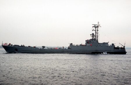 Les navires de débarquement de la classe Polnochny. Construit à Gdansk entre 1967 et 2002 à 108 exemplaires. Leur longueur est de 73 mètres et ils déplacent 834 tonnes à pleine charge, soit 12 véhicules d’infanterie ou 4 chars lourd et 250 fantassins.