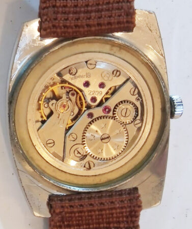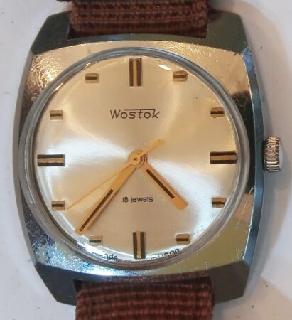 Mentions sur le calibre : n° de série (81569) sur la platine, logo Vostok et камн-18 (18 rubis) sur un pont, cinq étoiles sur le rochet.