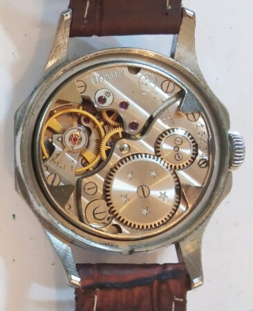 Mentions sur le calibre : n° de série (13454) et 2-60 (2e trimestre 1960) sur un pont, ancien logo de la fabrique de Tchistopol (initiales dans un cercle bordé de triple traits) et 17 камeн sur un autre, 5 étoiles sur le rochet, cotes de Genèves.