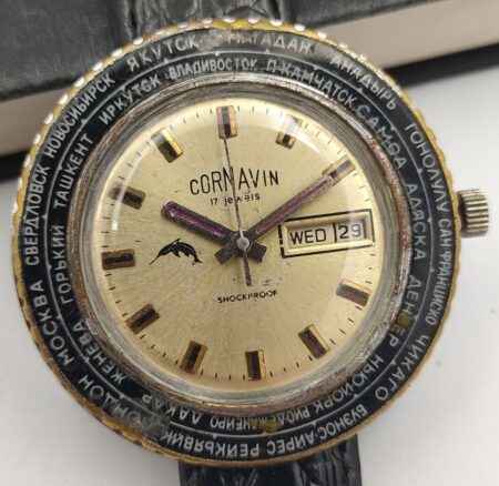 Remarque : Ce modèle de Raketa est dénommé « Goroda » (villes), parce qu’une lunette mobile, (ici extérieure) porte le nom de villes situées sur différents fuseaux horaires. Il suffit de placer le nom de la ville du fuseau où l’on se trouve pour savoir l’heure dans les autres villes en se référant à l’index de 24 heures.