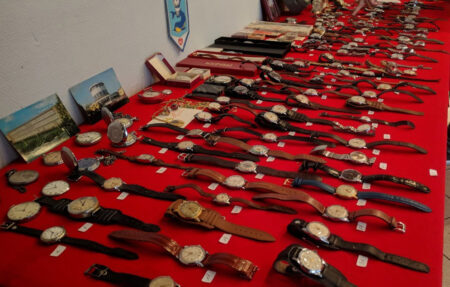 Par type : 948 montres bracelets (toutes avec bracelet qui sont parfois eux-même des pièces de collection) + 26 montres de poche + 19 montres-bijoux + 33 horloges et pendules + 49 réveils et pendulettes. Ou, si l’on préfère: 709 montres pour hommes + 248 montres pour dames + 37 montres pour jeunes + 82 horloges, pendules, réveils etc.