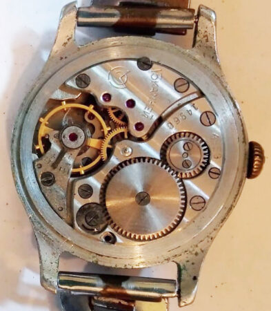 Mentions sur le calibre : 15 камней et logo de la fabrique (2M rond) sur un pont, 4-58 (4e trimestre 1958) et n° de série (14950) sur un autre, côtes de Genève.