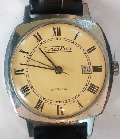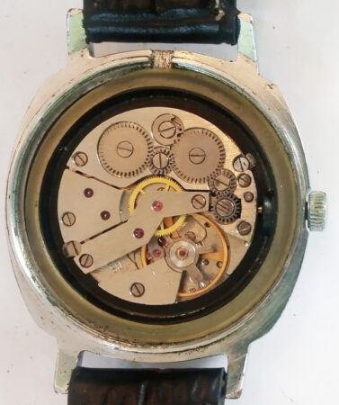 Mentions sur le calibre : Logo de la fabrique (un 2 dans un M), 2414 et SU (Soviet Union) le tout sur la platine.