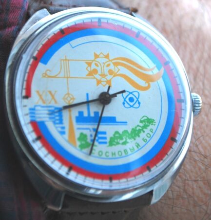 Montre bracelet, mécanique, produite par la Fabrique de Montres de Petrodvorets produite pour les 20 ans le la centrale nucléaire de Léningrad