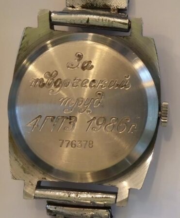 Au dos de cet exemplaire, cette gravure: La mention dit: « За творческий труд 4 Гражданский Промышленный Завод 1986 Г. », à savoir: Pour le travail créatif à la 4e Fabrique d’État de roulements, 1986.