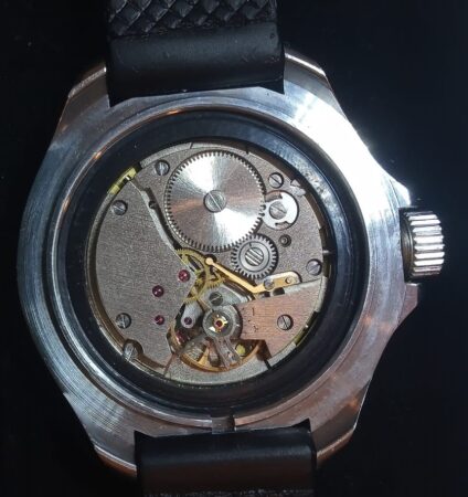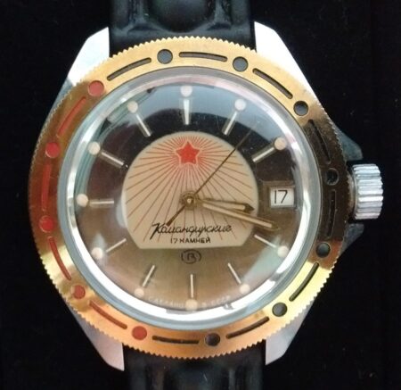 Remarque : La Kommandisrskie « rising star » (parfois appelée « rising sun ») est un modèle très apprécié des collectionneur a été fabriqué de 1989 à 1993 (mais les modèles Сделано в СССР jusqu’en 1991 – voir ici un de ces modèles). L’essentiel de sa production a été exporté, surtout en Italie et aux USA. Aux USA, c’est la firme Vremir qui l’a importé à partir de 1991. Les Vremir ne se distinguent des Vostok standards que par le dos des boîtiers. Ce modèle connaît quelques variantes (couronne Amphibia et lunette dorée, ce qui indique un modèle forcément post-soviétique, couronne Komandirskie et lunette dorée, couronne Komandirskie et lunette chromée). La trotteuse est le plus souvent dorée, mais parfois rouge. Les fond diffèrent selon les années et la destination, les boîtiers varient (341 chromé, 349 doré, 339 avec la couronne à deux heures). Mon modèle est le plus courant (boîtier 341, couronne et trotteuse dorées).