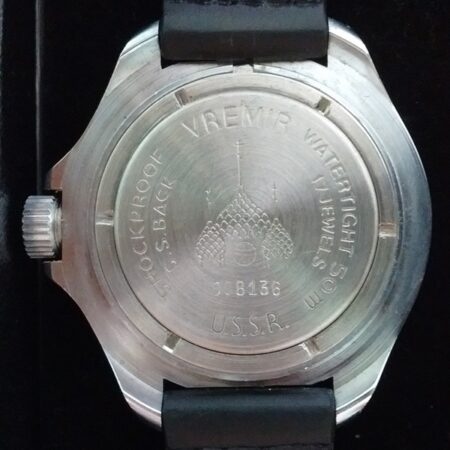 Gravure sur le fond : VREMIR en haut ; logo de TimePeace (trois clochers à bulbe avec l’horloge) au centre ; Shockproof C.C. back à gauche ; watertight 50m / 17 jewels à droite; USSR / 008136 (numéro individuel) en bas.