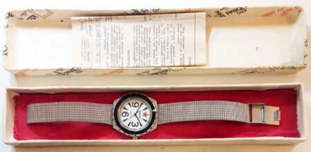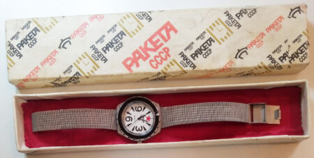 Remarque : Montre dans son emballage d’origine (une boîte en carton marqués des mentions PAKETA CCCP en rouge et en noir), avec son bracelet et son passeport d’origine. Ce modèle a été équipé d’au moins deux types de bracelet et de lunette (l’autre type de lunette porte un index blanc)