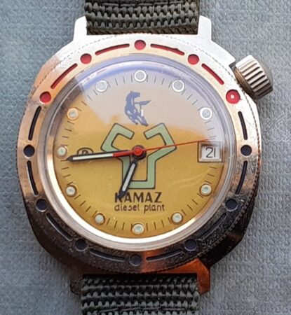 Montre bracelet, mécanique, à simple tantième, étanche de la Fabrique de Montre de Tchistopol avec motif du département des moteurs diesel de la fabrique automobile KamAZ