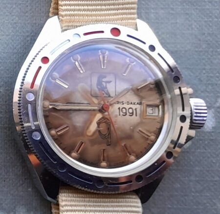 Montre bracelet, mécanique, à simple tantième, étanche de la Fabrique de Montre de Tchistopol avec motif la première participation au rallye Paris Dakar de la fabrique automobile KamAZ