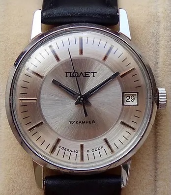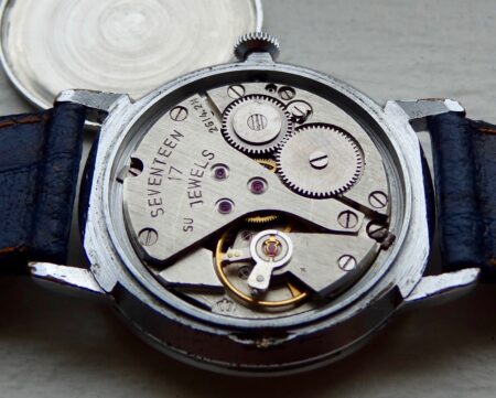 Mentions sur le calibre : dernier logo Poljot (couronne) sur la platine, SEVETEEN 17 JEWELS, SU, et 2614.2H sur le pont.