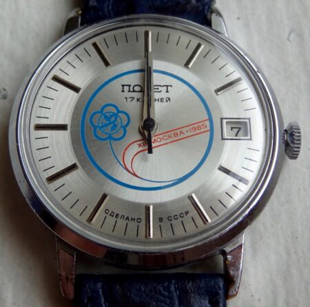 Le cadran porte le symbole du Festival mondial de la jeunesse de 1985 (pour en savoir plus sur ce motif):