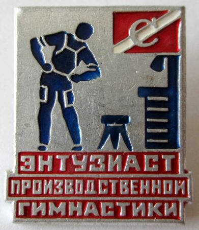 Au début des années 1970, un poste de moniteur de gymnastique est apparu dans les grandes usines et les bureaux, qui était responsable de l’organisation (et d’autres événements sportifs). Ci-dessous: un insigne d’animateur de gymnastique industrielle formé par le Spartak de Moscou (voir ici l’histoire du Spartak) :