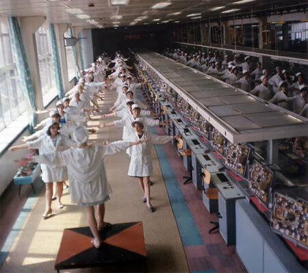 Les reportages photographiques sur les fabriques horlogères s’attardent souvent sur les séances de gymnastiques collectives.