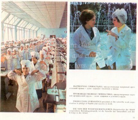Ces séances étaient appelées « gymnastique au travail » (производственная гимнастика) et parfois « minute d’éducation physique » (Физминутка). Les exercices étaient assez simples : marcher, s’étirer, se pencher, s’accroupir. Entre 1961 et 1991, un programme spécial de dix minutes a été diffusé tous les jours de la semaine sur la station de radio de l’Union (Radio-1). À 11 heures, les voix saluent les Soviétiques et les invitent à faire quelques exercices.